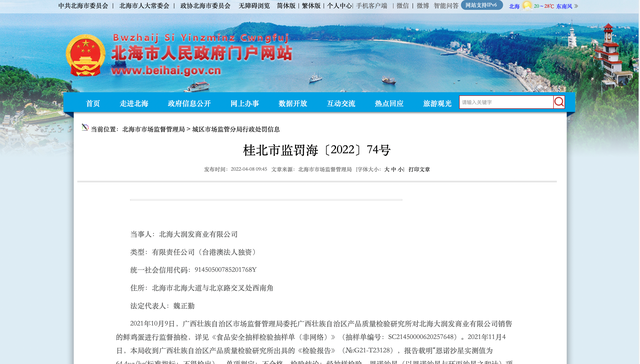 根據(jù)桂北市監(jiān)罰!2022〕74號(hào)文書(shū)顯示,2021年10月9日,廣西壯族自治區(qū)市場(chǎng)監(jiān)督管理局委托廣西壯族自治區(qū)產(chǎn)品質(zhì)量檢驗(yàn)研究所對(duì)北海大潤(rùn)發(fā)商業(yè)有限公司銷(xiāo)售的鮮雞蛋進(jìn)行監(jiān)督抽檢。2021年11月4日,廣西壯族自治區(qū)市場(chǎng)監(jiān)督管理局收到廣西壯族自治區(qū)產(chǎn)品質(zhì)量檢驗(yàn)研究所出具的《檢驗(yàn)報(bào)告》,報(bào)告載明“恩諾沙星實(shí)測(cè)值為64.4μg/kg(標(biāo)準(zhǔn)指標(biāo):不得檢出),單項(xiàng)判定:不合格,檢驗(yàn)結(jié)論:經(jīng)抽樣檢驗(yàn),恩諾沙星(以恩諾沙星與環(huán)丙沙星之和計(jì))項(xiàng)目不符合GB 31650-2019《食品安全國(guó)家標(biāo)準(zhǔn) 食品中獸藥最大殘留限量》要求,檢驗(yàn)結(jié)論為不合格。”