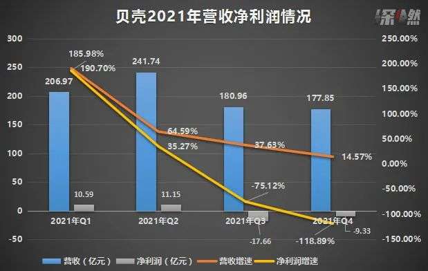 分開來看,2021年第一季度和第二季度,貝殼的營收、凈利潤和增速均表現(xiàn)尚可。一季度,公司營收206.97億元,凈利潤10.59億元;二季度營收241.74億元,凈利潤11.15億元;到了第三季度,營收下降為180.96億元,凈虧損17.66億元,第四季度,營收進(jìn)一步降至177.9億元,凈虧損為9.33億元。