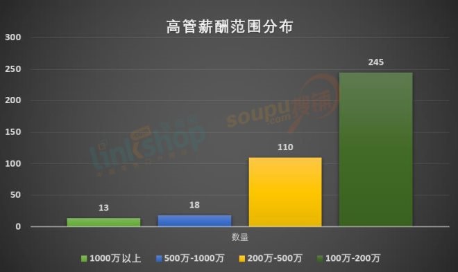 整體來(lái)看,76位女性高管中,年薪超300萬(wàn)元的有13位,年薪在200萬(wàn)(含)至300萬(wàn)(不含)的有7位,年薪在100萬(wàn)(含)至200萬(wàn)以內(nèi)(不含)的有56位,占比高達(dá)73.68%。
