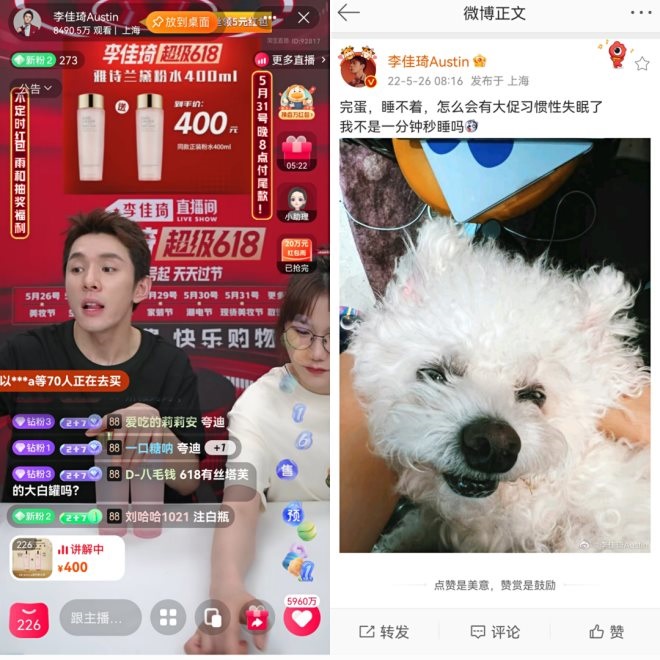 5月26日上午八點(diǎn),距離天貓618預(yù)售正式開(kāi)啟還有12個(gè)小時(shí)。李佳琦發(fā)了一條微博,調(diào)侃自己患上了“大促習(xí)慣性失眠”,配圖是他的網(wǎng)紅愛(ài)寵never。