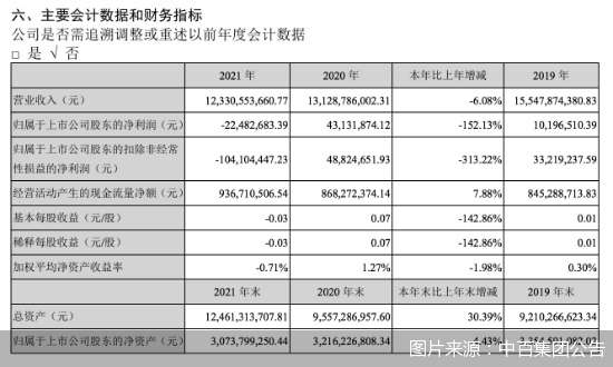而在2021年,中百集團(tuán)出現(xiàn)營(yíng)收、凈利雙降,并出現(xiàn)虧損。財(cái)報(bào)顯示,中百集團(tuán)全年?duì)I業(yè)收入123.31億元,同比下降6.08%;歸屬于上市公司股東的凈利潤(rùn)為-0.22億元,上年同期為0.43億元,同比下降152.13%。2022年第一季度,中百集團(tuán)營(yíng)收34.46億元,歸屬于上市公司股東的凈利潤(rùn)為219.9萬(wàn)元,分別同比下滑1.25%、9.50%。