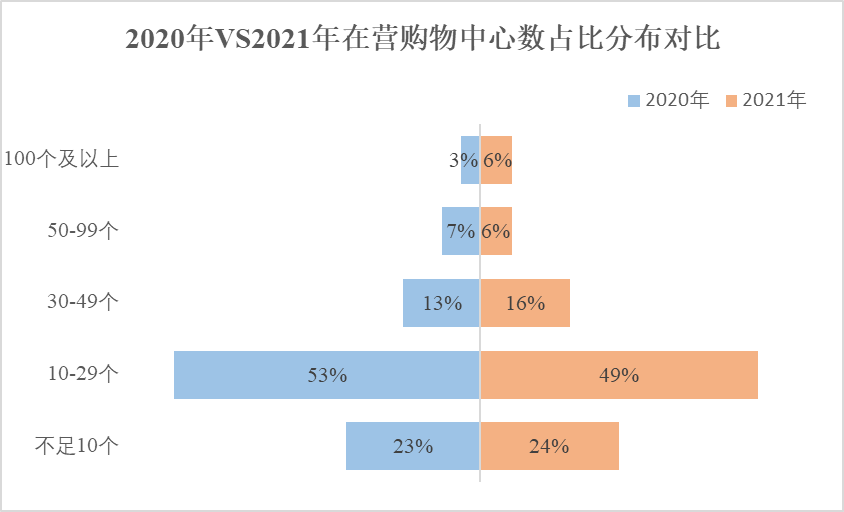 圖1 2020年VS2021年在營(yíng)購(gòu)物中心數(shù)占比分布對(duì)比