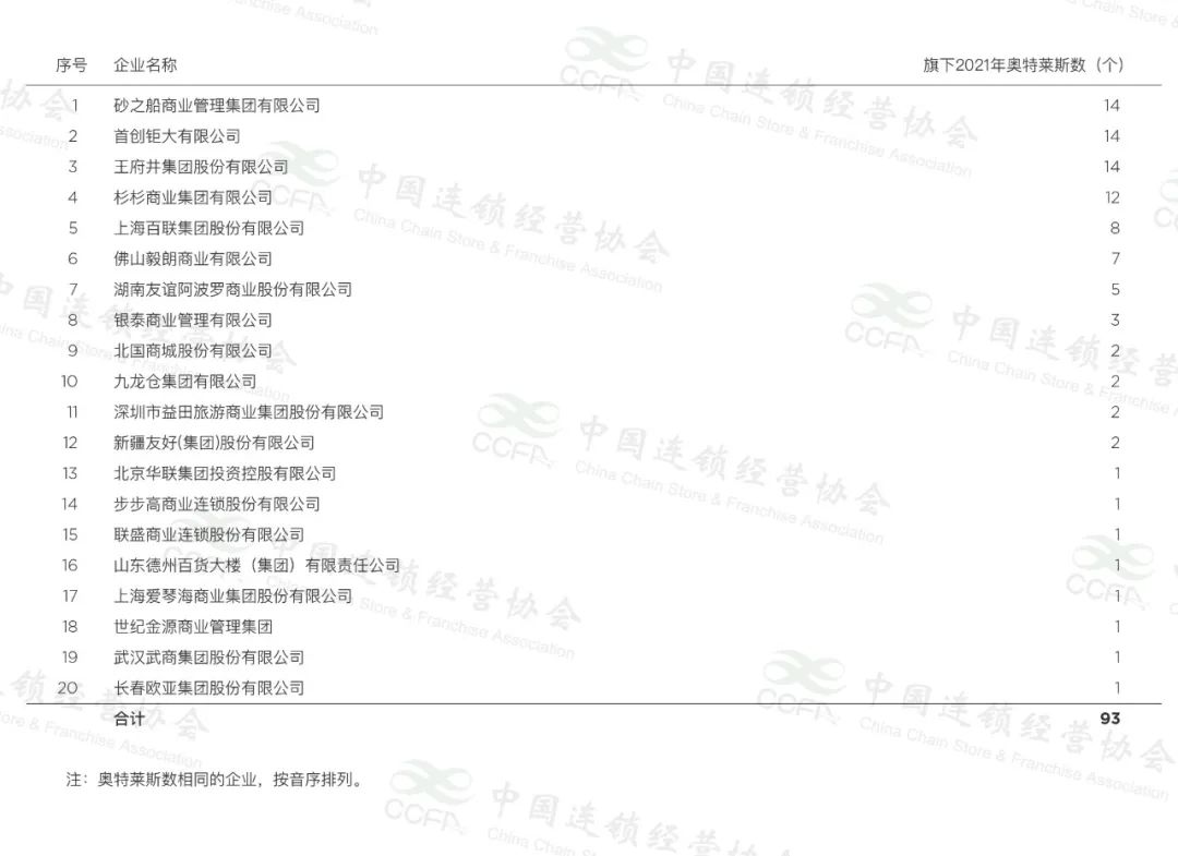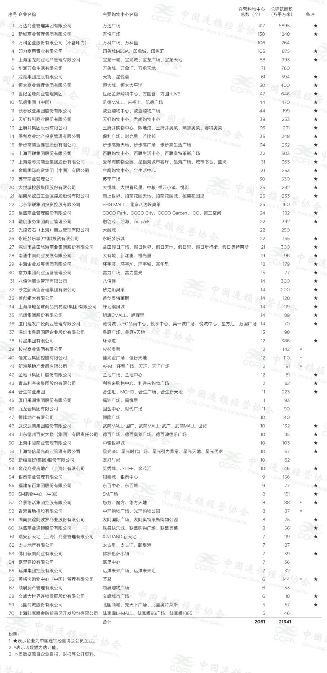 5月31日,根據(jù)“2021年中國(guó)購(gòu)物中心年度調(diào)查統(tǒng)計(jì)”結(jié)果,按照各企業(yè)2021年底在營(yíng)的各類(lèi)購(gòu)物中心數(shù),中國(guó)連鎖經(jīng)營(yíng)協(xié)會(huì)(CCFA) 發(fā)布“2021年中國(guó)購(gòu)物中心企業(yè)TOP70”,其中包括開(kāi)發(fā)運(yùn)營(yíng)購(gòu)物中心的綜合零售商。同時(shí),根據(jù)本次調(diào)查結(jié)果,協(xié)會(huì)首次公布全國(guó)各主要奧特萊斯開(kāi)發(fā)運(yùn)營(yíng)企業(yè)名單。