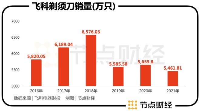 2018年至2021年,飛科剃須刀的銷量分別為6576.03萬只、5585.58萬只、5655.8萬只、5461.81萬只,4年少賣1000多萬只,而剃須刀業(yè)務(wù)長期貢獻(xiàn)公司7成以上營收,8成以上毛利,這在較大程度上“掣肘”其業(yè)績表現(xiàn)。