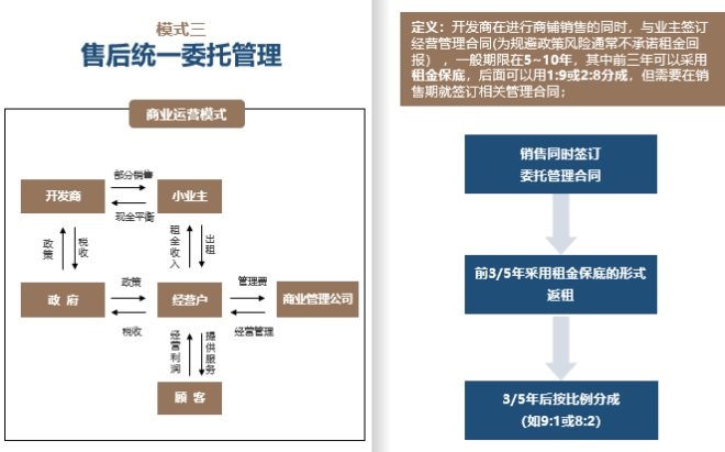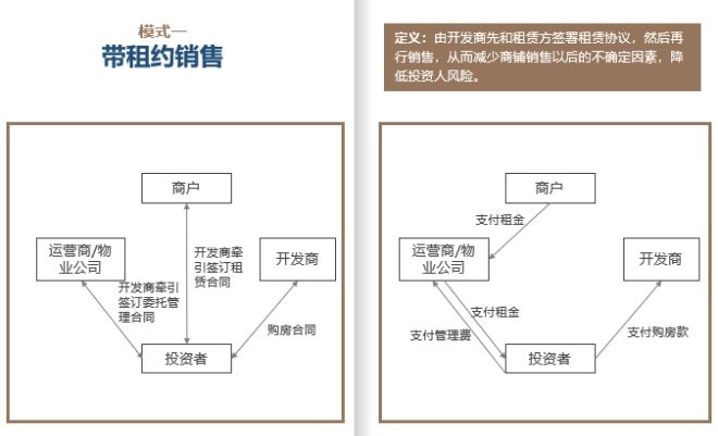 常見的租售結(jié)合模式主要有三種:帶租約銷售、節(jié)點鋪持有其余銷售、售后統(tǒng)一委托管理。