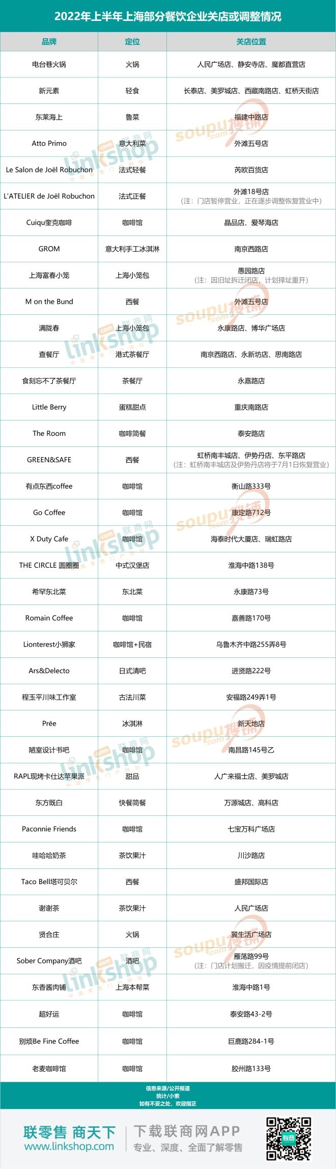 據(jù)聯(lián)商網(wǎng)不完全統(tǒng)計,2022年上半年,上海至少有39家餐飲品牌、超過53家門店出現(xiàn)暫停營業(yè)或閉店現(xiàn)象。品類涉及火鍋、咖啡、西餐、冰淇淋以及滬菜、川菜等地方菜色,其中包括電臺巷火鍋、M on the Bund、查餐廳、GROM、東萊海上等多家知名品牌。
