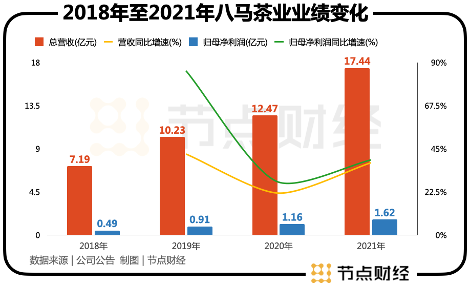 結合今年的疫情,八馬茶業(yè)的解釋有一定的合理性。拉長時間線,2018年其營收約為7.19億元,2021年增長至約17.44億元,漲幅約為143%;同期凈利潤從4810萬元增長至1.62億元,漲幅約為237%。