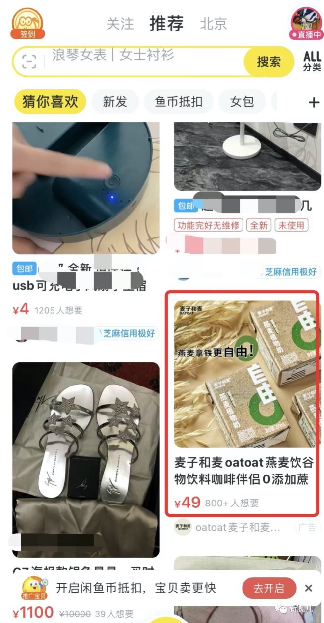 再看第三名的oatoat麥子和麥,付款人數(shù)1萬(wàn)+。和歐扎克不同,oatoat麥子和麥沒(méi)有請(qǐng)明星代言,卻做了大量廣告投放。例如搜索過(guò)他們后,閑魚(yú)算法會(huì)推薦oatoat麥子和麥廣告。