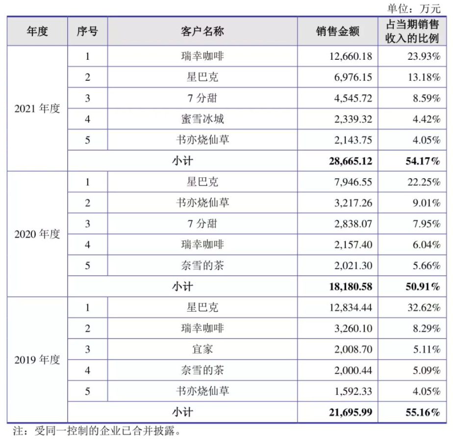 大客戶在德馨食品的收入中影響很大——前五大客戶合計(jì)占當(dāng)期銷售收入的一半比重。前幾大重要客戶維持在星巴克、瑞幸咖啡、宜家、奈雪的茶、書亦燒仙草、7分甜、蜜雪冰城、宜家。