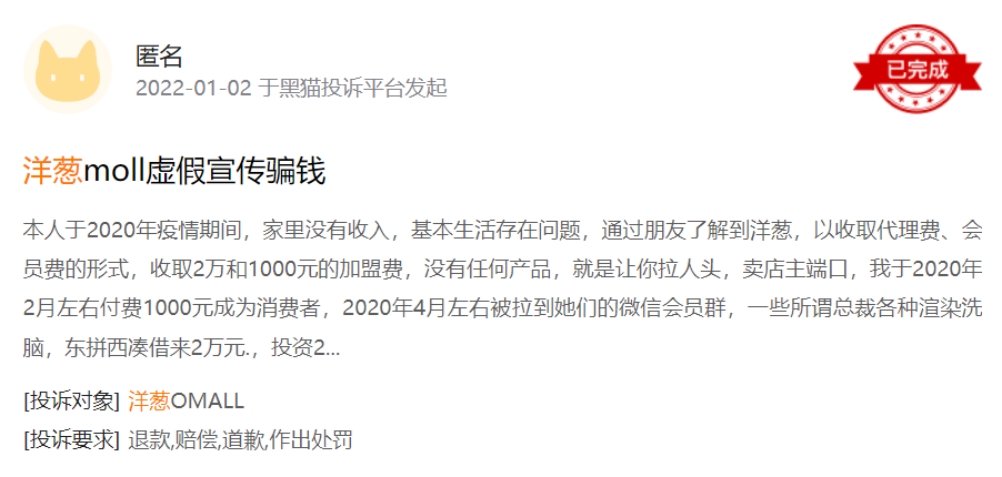話雖如此,但是網(wǎng)絡(luò)上關(guān)于“洋蔥集團(tuán)涉?zhèn)鳌钡脑u(píng)論仍是鋪天蓋地。在黑貓投訴上,與“洋蔥集團(tuán)”相關(guān)的投訴有41條,其中虛假宣傳、銷售假貨、退款難等詞均高頻出現(xiàn)。