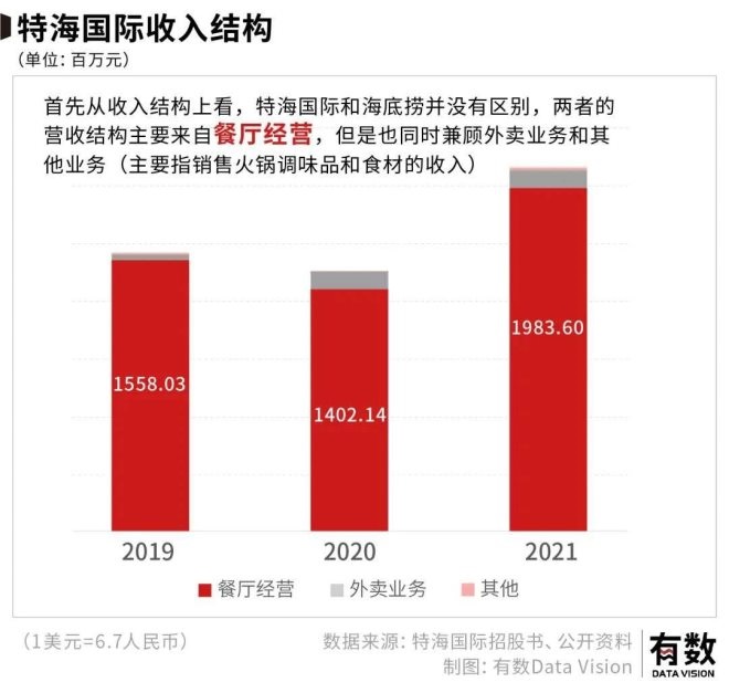 從收入結構上看,兩者的營收主要來自餐廳經(jīng)營,也同時兼顧外賣業(yè)務和其他業(yè)務(主要指銷售火鍋調味品和食材的收入)。