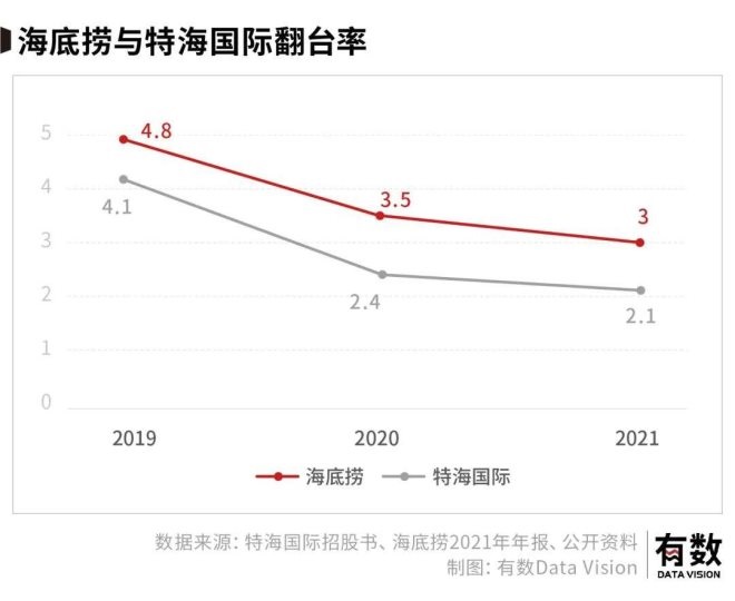 首先是翻臺率:根據(jù)特海國際招股書顯示,特海國際翻臺率已經(jīng)從2019年的4.1次/天降至2021年的2.1次/天,幾乎腰斬,海底撈也是從2019年的4.8降低至3的水平。