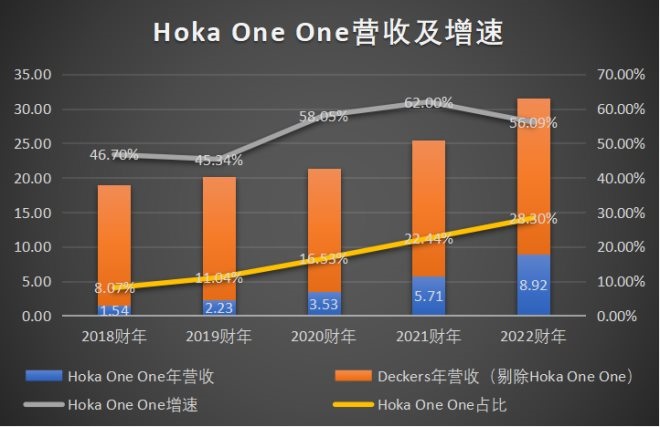 但更重要的是,在疫情期間,Hoka One One的營收增速不降反增,從疫情前兩年30%的增速,一躍至近三年50%以上的增速,2022財年一季度,Hoka One One的營收甚至一度超越了UGG,它也成為了Deckers集團在疫情后保持整體增速最大的引擎。