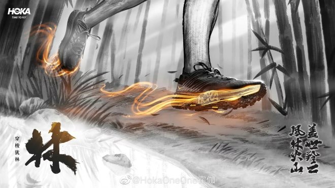 這也促使Hoka One One也在產(chǎn)品上做出了本土化的改變。不僅將旗下的跑鞋特地推出了中國紅的配色,去年3月,Hoka One One還發(fā)布了Speed goat4“羚云”配色跑鞋,主打《孫子兵法》里“風(fēng)林火山”的概念,這也是其首次針對中國市場推出的跑鞋。