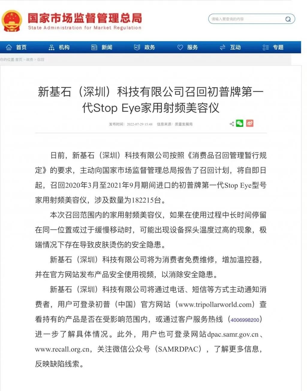 《化妝品財(cái)經(jīng)在線》記者注意到,當(dāng)前,新基石(深圳)科技有限公司主動(dòng)召回的初普牌第一代Stop Eye家用射頻美容儀已經(jīng)無(wú)法在各大電商平臺(tái)搜索到。此前,包括新華網(wǎng)等在內(nèi)的多家媒體報(bào)道TriPollar Stop Eye美容儀檢測(cè)發(fā)現(xiàn)使用時(shí)表面溫升嚴(yán)重超標(biāo),存在燙傷隱患。