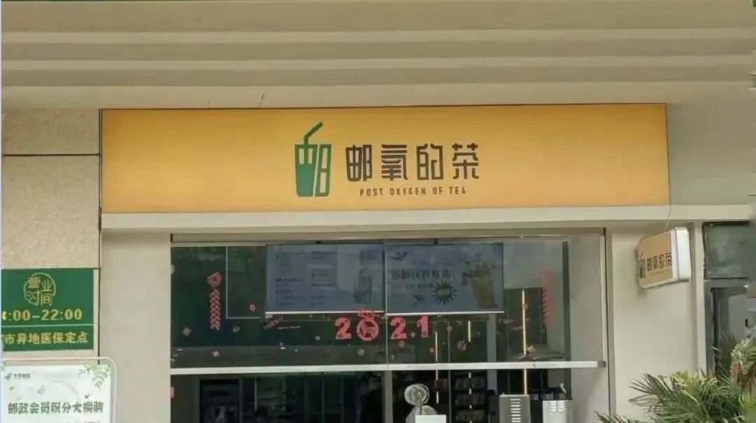 彼時,#中國郵政成立奶茶店#相關(guān)話題登上熱搜。一福建福州市網(wǎng)友爆料,自己家樓下郵政大藥房一家名為「郵氧的茶」的奶茶店下悄悄開張,店面設(shè)計(jì)和產(chǎn)品包裝袋都以“中國郵政”經(jīng)典的黃綠色簡約風(fēng)呈現(xiàn)。