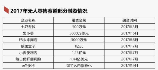 據(jù)創(chuàng)業(yè)邦研究中心統(tǒng)計(jì),僅2017年,共有138家無(wú)人零售企業(yè),其中57家獲得融資,國(guó)內(nèi)這一領(lǐng)域的創(chuàng)業(yè)公司融資總額達(dá)到了48.47億元,其中,每日優(yōu)鮮便利購(gòu)以超過(guò)10億元的巨額融資領(lǐng)跑行業(yè),果小美、猩便利、小e微店等也企業(yè)也均獲得了億元以上融資。