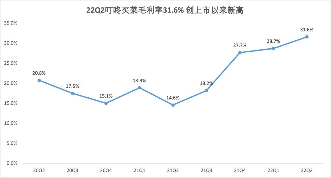 22Q2叮咚買菜毛利率31.6%比去年同期提升了17個百分點,環(huán)比一季度提升2.9個百分點。