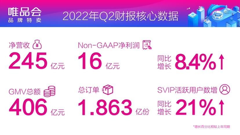 8月19日,唯品會(huì)發(fā)布2022年第二季度財(cái)報(bào),公司當(dāng)季實(shí)現(xiàn)凈營收245億元,歸屬于公司股東的Non-GAAP凈利潤16億元,同比增長8.4%;利潤水平和整體利潤率均實(shí)現(xiàn)同比增長。