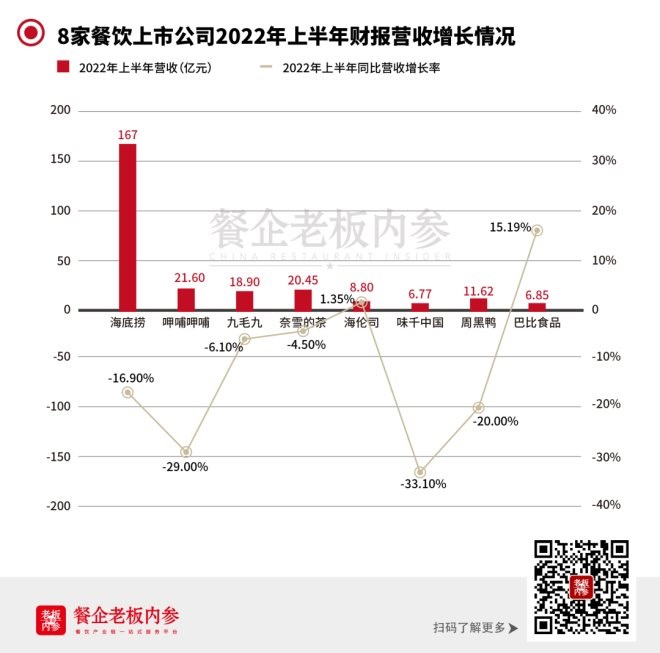 三年疫情,數月管控,讓許多餐飲人艱難求生。在如此重壓之下,海底撈、呷哺呷哺、九毛九等一眾上市餐企也給出了自己的半年報,沒有一家餐企能夠實現營收、凈利潤雙漲,今年財報總體“哀鴻遍野”。