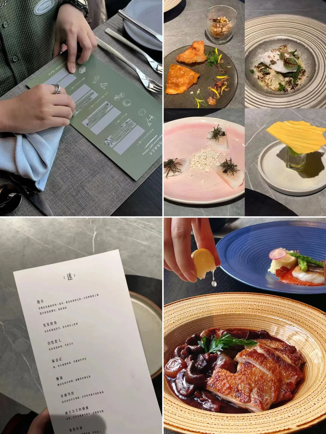 廣州?·探索料理,從店名開(kāi)始就四處透著“盲”味的氣息。套餐一共14道菜品,不僅是看名字猜不出菜品,甚至連菜端上桌后,都需要自行探索才能猜到食材,全程體驗(yàn)“盲盒感”。