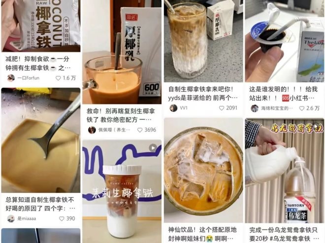 對比驗證下來,一款咖啡的火爆程度,和自制咖啡的傳播率是成正比關(guān)系的。比如,“自制生椰拿鐵”在小紅書的打卡筆記達(dá)到了3萬+篇。