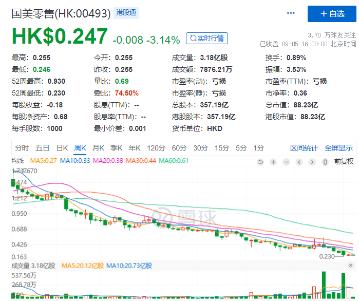 截至2022年9月5日收盤,國美零售收報0.247港元,總市值僅剩88.23億港元,意味著在過去18個月,國美零售股價跌去超90%,比18個月前的高點(diǎn),市值跌了超800億港元。