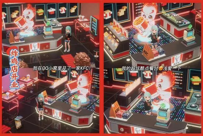 超級(jí)QQ秀也聯(lián)合李寧、Jordan、Vans等時(shí)尚品牌在虛擬空間里搭建“潮流新主場(chǎng)”,給用戶提供了更多極具個(gè)性化和品牌特點(diǎn)的服裝。除此之外,超級(jí)QQ秀更是跨次元聯(lián)動(dòng)“肯德基”,在超級(jí)QQ秀里復(fù)刻了肯德基實(shí)體店的布局,用戶通過(guò)在虛擬空間里與肯上校對(duì)話來(lái)領(lǐng)取“肯德基雞腿幣”,這可以用于購(gòu)買店內(nèi)虛擬定制家具,真正打造專屬于自己的“肯德基小窩”。