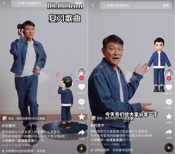 為了給自己9月3日的直播預(yù)熱,劉德華在抖音上發(fā)布了一則和抖音仔仔合拍的短視頻,分享了自己的直播準(zhǔn)備工作。在短視頻中,劉德華的抖音仔仔身著和劉德華相同的穿搭風(fēng)格,和他一同進(jìn)行排練、吃飯,成為了他的完美化身。