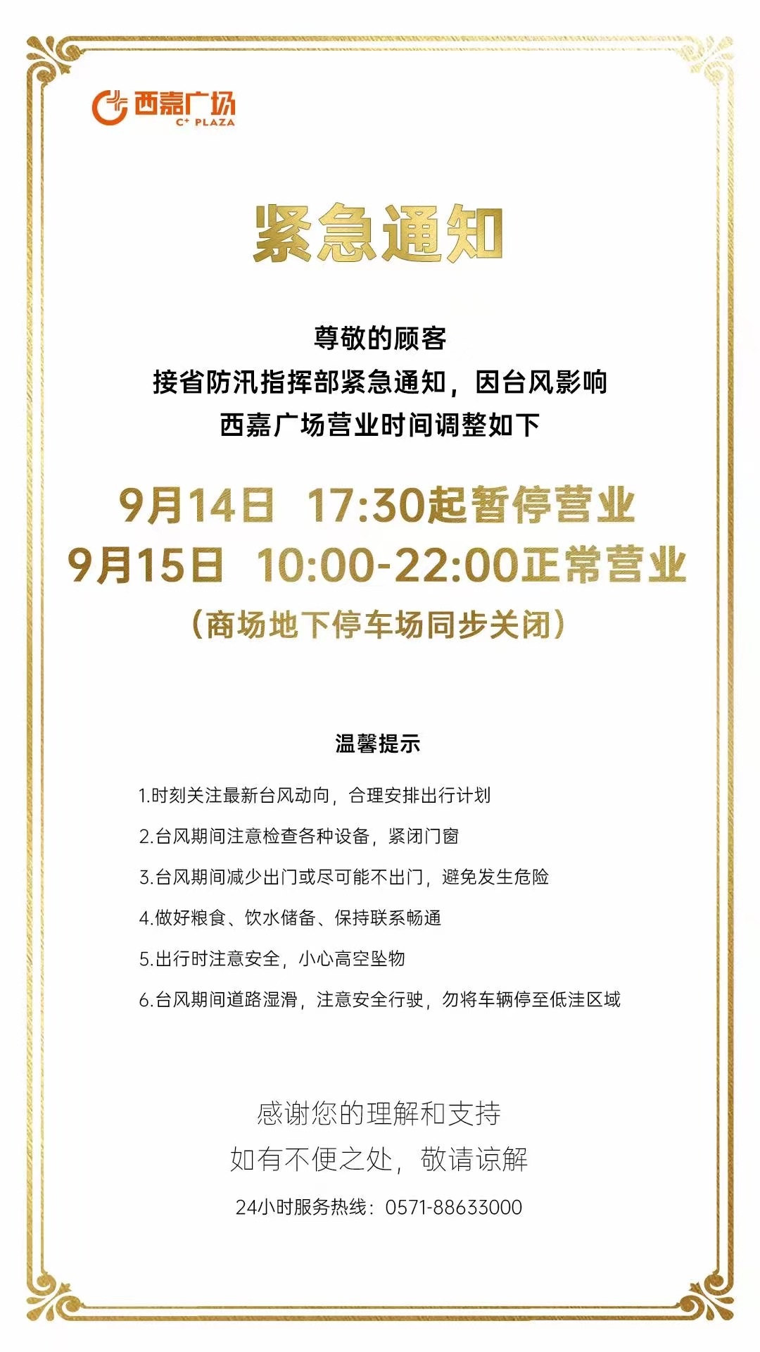 杭州西嘉廣場:9月14日,17::30起暫停營業(yè),15日照常營業(yè)。