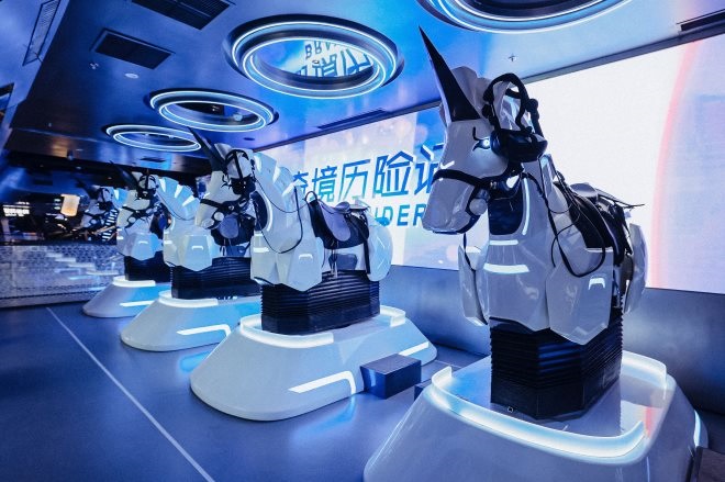 這家門店坐落在迪士尼小鎮(zhèn)的黃金地段,即“巨型唐老鴨”湖畔。近5000平方米的門店分上下兩層,一層包含西游降魔-起源之戰(zhàn)、天宮競(jìng)技場(chǎng)-量?沖突、?天幻境、奇境歷險(xiǎn)記、疾速空間等 3 款大空間行走多人沉浸式 VR 互動(dòng)體驗(yàn)及6大 XR 創(chuàng)新載具體驗(yàn)。