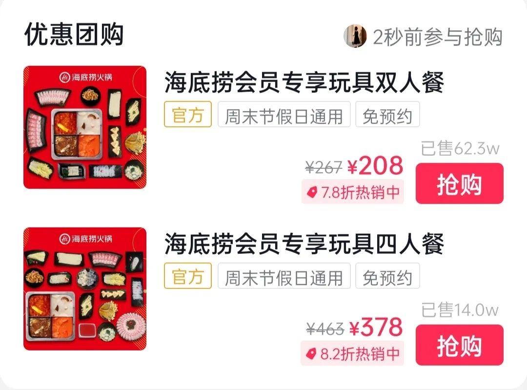 仔細看這個套餐內容,“海底撈會員專享玩具雙人餐”,208元一份,2種鍋底加一些菜品,還有兩個小玩具。