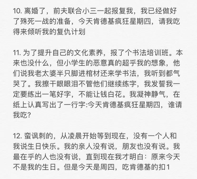 還有一種情緒營銷,抓住大家“吃瓜”或者“聽故事”的情緒。內容前面是百態(tài)人生,最終都是一個出其不意的轉折,落腳到一個地方,讓人覺得好笑、有趣,激發(fā)傳播欲甚至創(chuàng)作欲。最經(jīng)典的莫過于肯德基的“瘋四”文學。