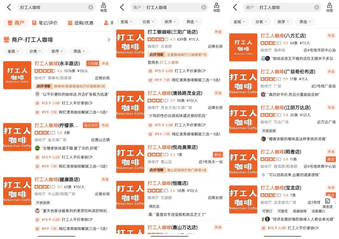 又或者直接把店名取為“打工人咖啡”,在杯子上貼“打工人打工魂”的貼紙。站在平價咖啡的定位上,用“打工人”和消費者做情感連接,“打工人咖啡”迅速拓店。大眾點評顯示,目前,品牌在無錫已經(jīng)開出了39家門店。