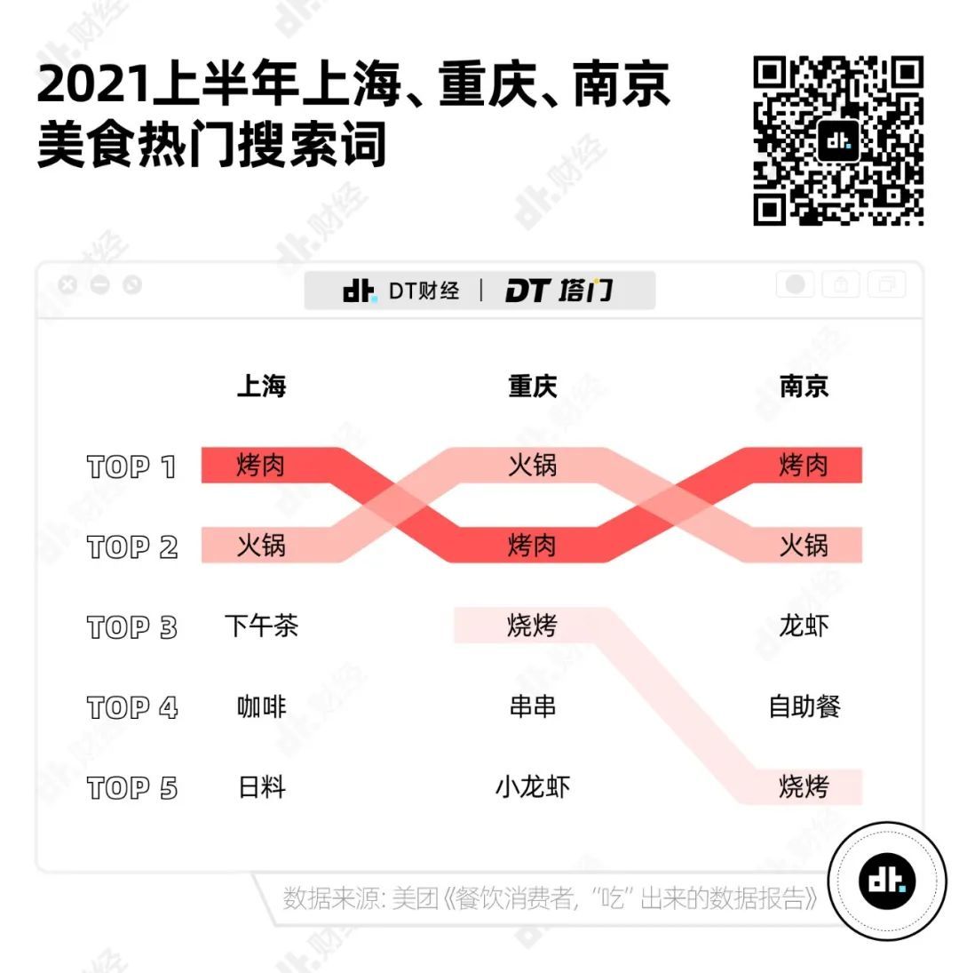 以上海、重慶和南京為例,根據(jù)美團(tuán)數(shù)據(jù),2021上半年這三座城市的美食熱門搜索詞TOP 2都是火鍋和烤肉。