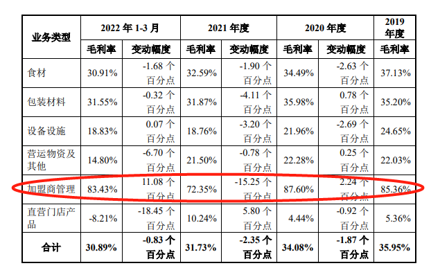 這主要是因為蜜雪走的是加盟經(jīng)營為主的路線,加盟店自負(fù)盈虧,公司不用承擔(dān)租金以及加盟店人員、水電等開銷。除了為加盟商提供食材、包裝、設(shè)備、物流等服務(wù),蜜雪加盟商管理的毛利率是最高的,從2019年到2022年1—3月,維持在72%—87%之間。而直營門店因為要給加盟店“打樣”,租金裝修等成本上升,再加上公司關(guān)閉了盈利不好的直營店,因此毛利率大幅下降,今年Q1甚至已經(jīng)為負(fù)數(shù)。