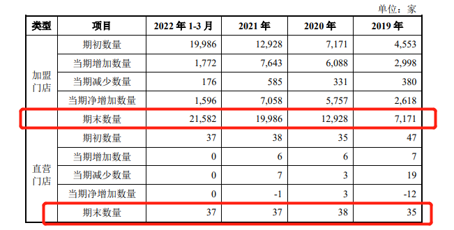 當(dāng)一家店賺到錢了之后,加盟商就會想擴(kuò)大店的數(shù)量,甚至進(jìn)行片區(qū)承包,以此來增加收益。這也進(jìn)一步推動了蜜雪加盟店的擴(kuò)張,從2020—2021年期間,蜜雪一年就開了7058家加盟店,平均一天開19家,算下來就是一個半小時開一家,這速度幾乎是瑞幸的三倍了。