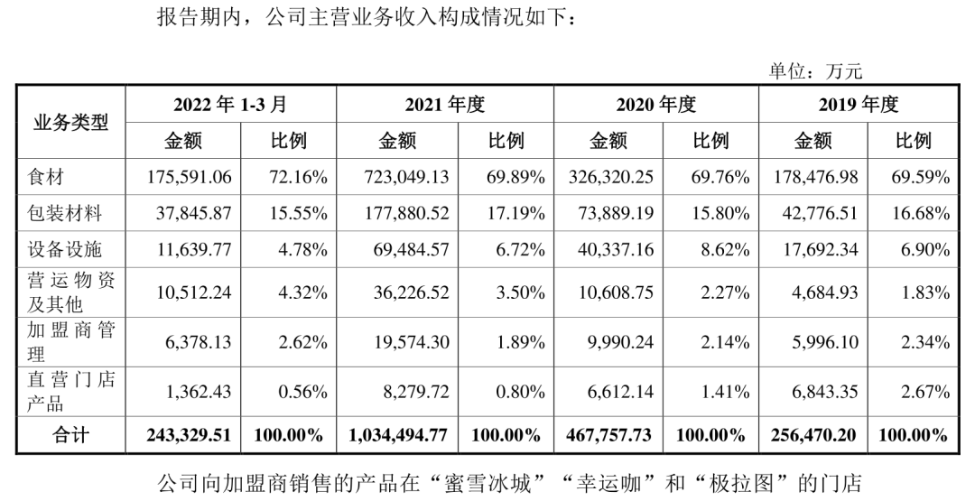 蜜雪冰城的“財富密碼”,都已經(jīng)寫在招股書里:低價、加盟、下沉市場。這家成立25年之久的公司,不僅是一家茶飲公司,更是一家食品供應鏈公司,還是一家隱形裝修公司。每一個加盟店都需要從蜜雪冰城總部那里統(tǒng)一采購食材原料,統(tǒng)一裝修公司作業(yè)。招股書顯示,蜜雪冰城2021年主營收入分別為食材、包材、設備設施,三者占主營收入比例分別為70%、17%、6.7%,三類疊加營收占比近94%。