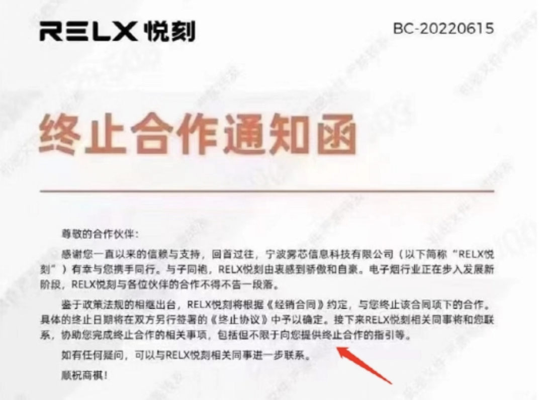 悅刻給經(jīng)銷(xiāo)商的終止合作通知函