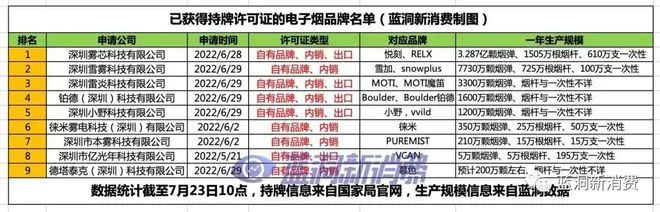 有業(yè)內(nèi)人士表示,國(guó)內(nèi)主流的電子煙品牌如魔笛、雪加、小野等基本都獲得了相應(yīng)的生產(chǎn)許可。據(jù)不完全統(tǒng)計(jì),目前已有128家企業(yè)9家品牌拿下生產(chǎn)許可證,其中市占率一度超過(guò)60%的霧芯科技,是獲批配額最高的一家。霧芯科技獲準(zhǔn)產(chǎn)能為1505萬(wàn)件電子霧化器可充電設(shè)備(每年),3.287 億個(gè)煙彈每年,610萬(wàn)件一次性電子霧化產(chǎn)品;可作參考的是,據(jù)藍(lán)洞數(shù)據(jù),目前已經(jīng)確定的換彈電子煙煙彈配額總量約為4.75億顆,煙具數(shù)量2275萬(wàn)根,一次性電子煙為971萬(wàn)根。