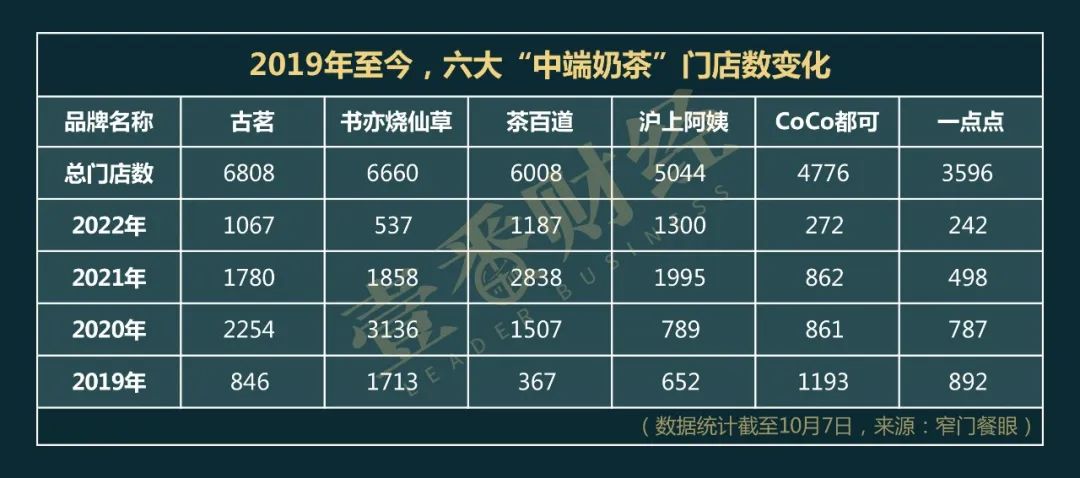 截至2022年10月7日,中端奶茶市場(chǎng)的六大品牌古茗、書(shū)亦燒仙草、茶百道、滬上阿姨、CoCo都可、1點(diǎn)點(diǎn)的門(mén)店數(shù)及近些年變化情況如下: