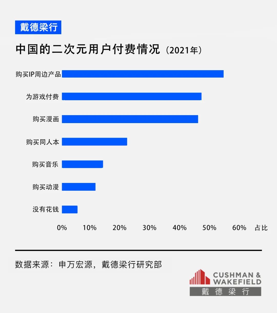 Z世代愿意購買ACGN的IP產(chǎn)品,包括音樂、手辦、Cosplay和周邊產(chǎn)品等,支持自己喜愛的虛擬形象。其中有56.2%的人愿意購買IP周邊產(chǎn)品;其次是游戲付費和漫畫購買,二者比例分別為48.55%和47.3%。