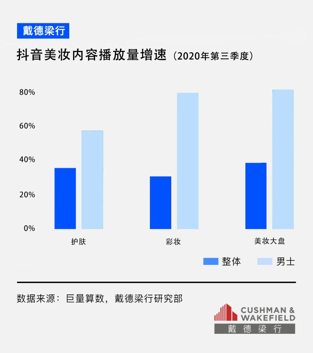 2020年第三季度,抖音平臺上男性用戶在觀看美妝護(hù)膚相關(guān)內(nèi)容的播放量增速,顯著超過整體用戶,且彩妝和美妝大盤的增速尤為亮眼;男士彩妝播放量的增速為80%,遠(yuǎn)高于整體播放量的31%增速。