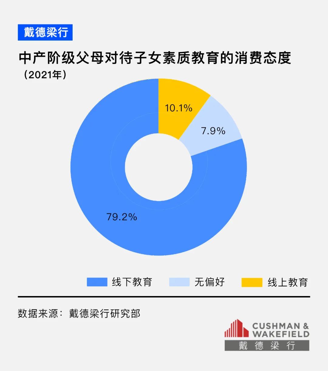 鑒于素質(zhì)教育的教學(xué)不僅對場地和教學(xué)材料有更高的要求,并且需要老師和學(xué)生的高度互動,相較于線上教育,79%的新中產(chǎn)父母更青睞讓孩子在線下培訓(xùn)班學(xué)習(xí)。