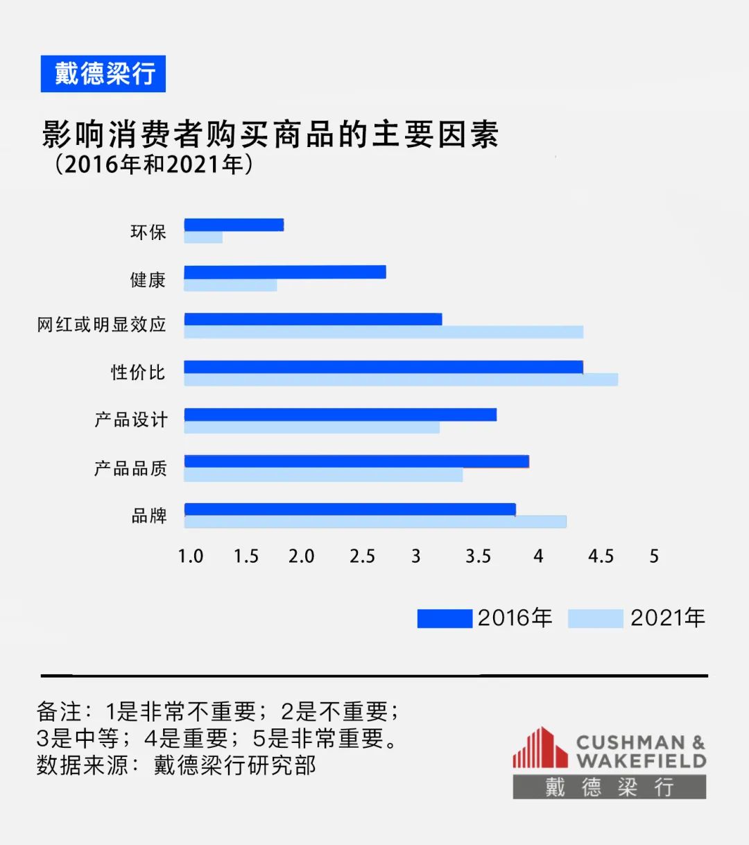 根據(jù)戴德梁行的調(diào)研,相較于過去五年,影響消費者購買產(chǎn)品的主要因素中,產(chǎn)品品質(zhì)、產(chǎn)品設(shè)計、健康和環(huán)保的重要性有所提升。
