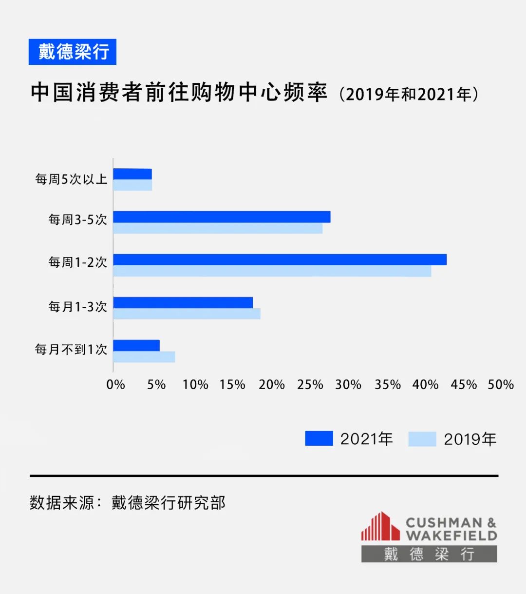 和2019年相比,2021年消費者去購物中心的頻率和消費意愿相較于疫情前走高。約73%的消費者每周游逛購物中心一次以上。