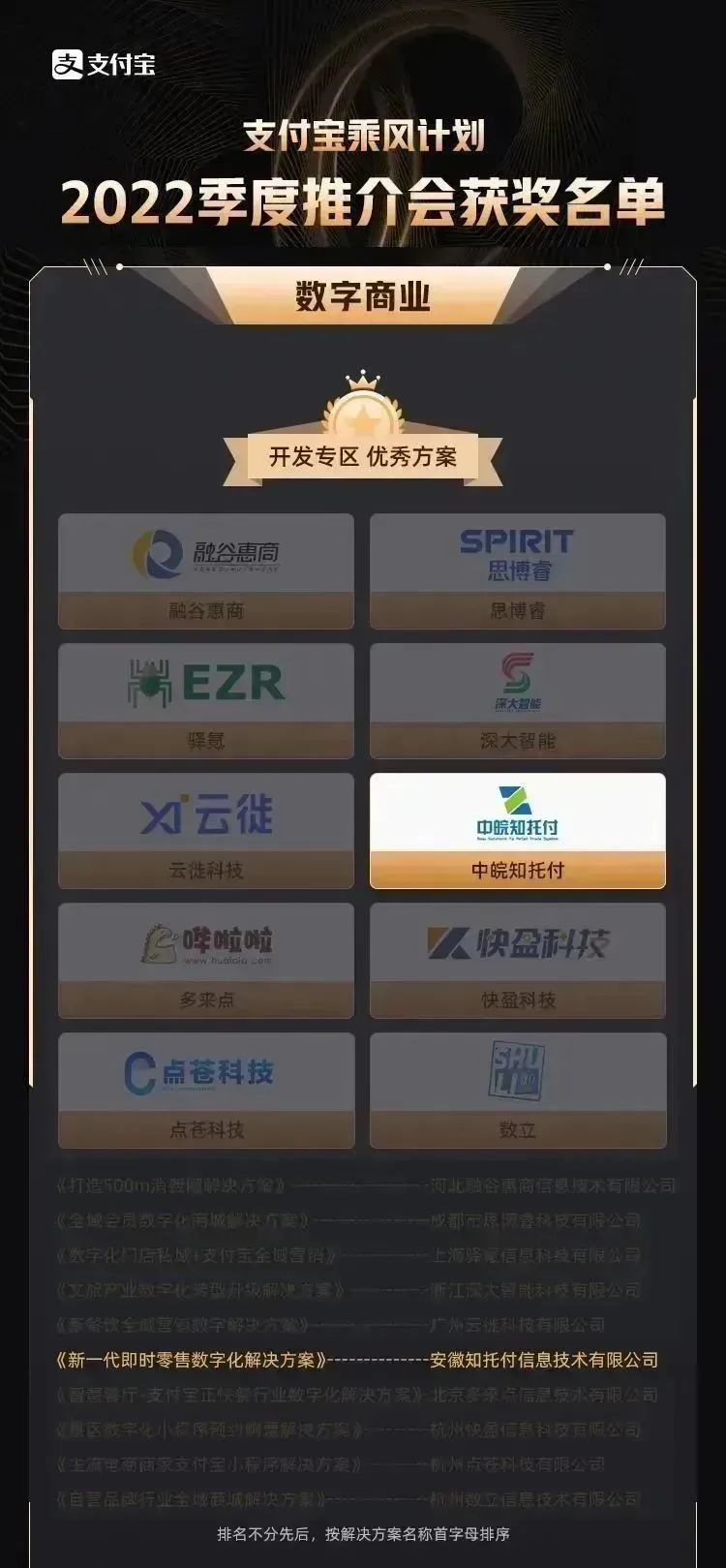 支付寶“乘風(fēng)計(jì)劃”數(shù)字商業(yè)開發(fā)專區(qū)優(yōu)秀方案,既是支付寶對(duì)于中皖知托付在產(chǎn)品技術(shù)及數(shù)字化運(yùn)營(yíng)上的認(rèn)可與肯定,也對(duì)我司未來發(fā)展給予了充分的支持及期待。在此,特別感謝支付寶及行業(yè)專家們對(duì)我司的關(guān)注和鼓勵(lì)!