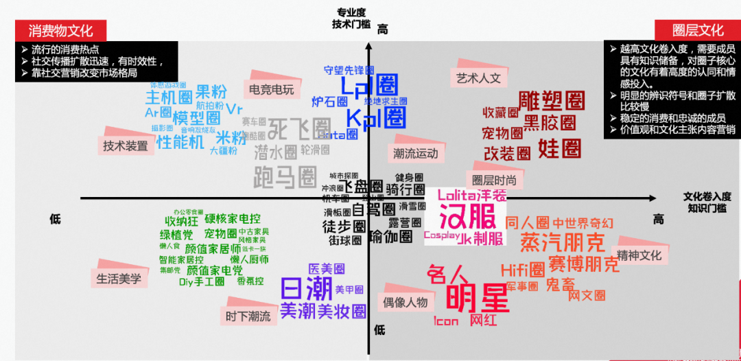 此后,TMIC將同好人群按照專業(yè)度門檻、文化卷入度,大致分為四個(gè)象限,越偏左的越偏消費(fèi)物文化,也是更偏向消費(fèi)類目;越偏右的越偏圈層文化,相對(duì)更小眾。