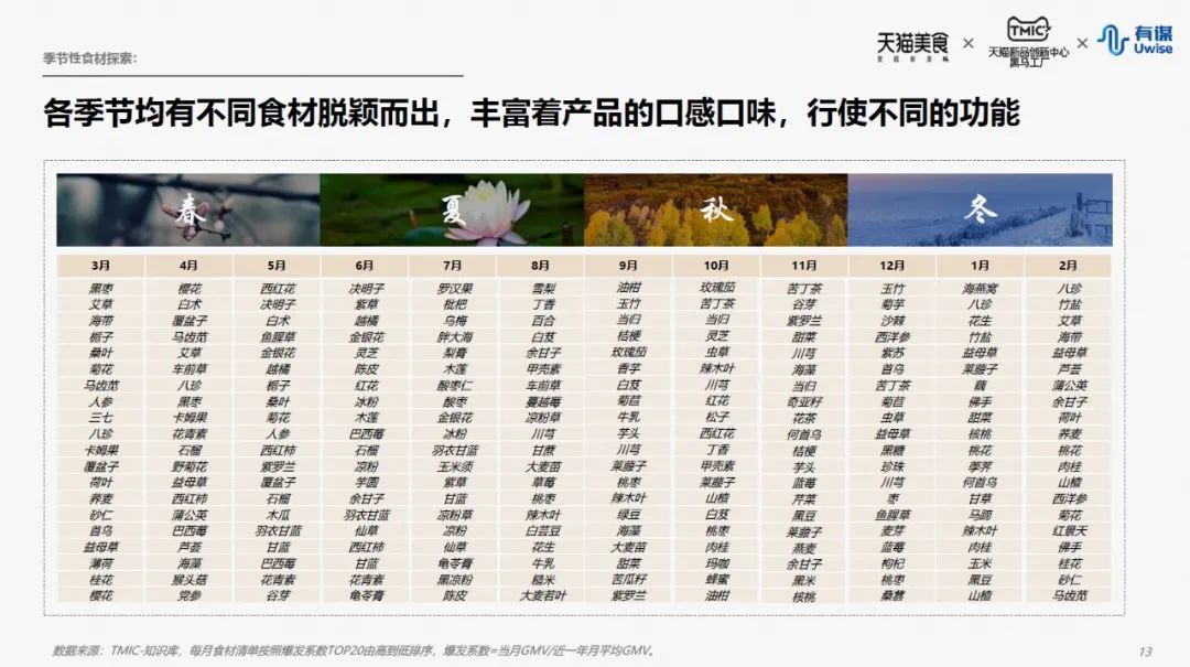 例如沖飲品類會(huì)借鑒保健滋補(bǔ)品類的藥食同源食材,來(lái)研究自己的新品方向。在今年,TMIC和沖飲行業(yè)合作,提取跨品類借鑒的食材元素,發(fā)布了季節(jié)性中式食材趨勢(shì)。