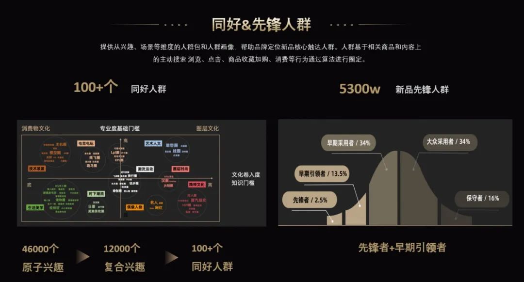 TMIC通過(guò)拆分風(fēng)格、功能、元素等不同關(guān)鍵詞組成的46000個(gè)“原子興趣“,再根據(jù)人對(duì)場(chǎng)景的需求認(rèn)識(shí),將“原子興趣”向上聚合為12000個(gè)可跨類目的“復(fù)合興趣”。最終通過(guò)結(jié)合當(dāng)前行業(yè)的流行趨勢(shì)和社會(huì)文化,得到了目前100個(gè)左右的同好人群。